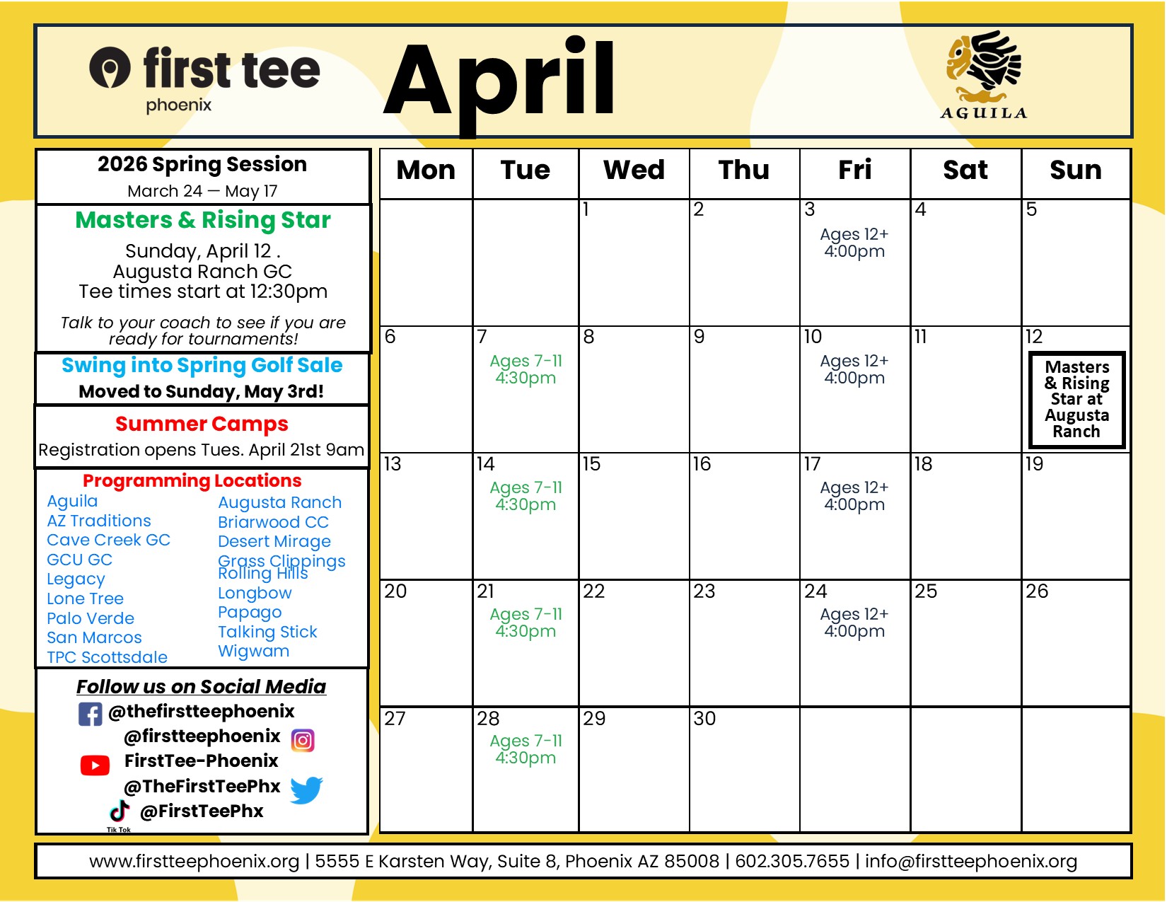 Members are invited throughout the year to special opportunities provided by First Tee – Phoenix locally, First Tee HQ and other partners. These opportunities will vary- discounted tickets to events, a family picnic, Golf sales, etc.