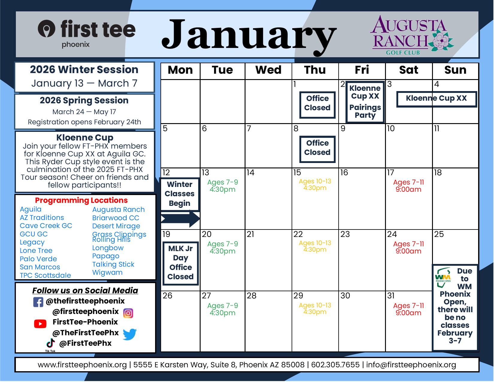 Members are invited throughout the year to special opportunities provided by First Tee – Phoenix locally, First Tee HQ and other partners. These opportunities will vary- discounted tickets to events, a family picnic, Golf sales, etc.