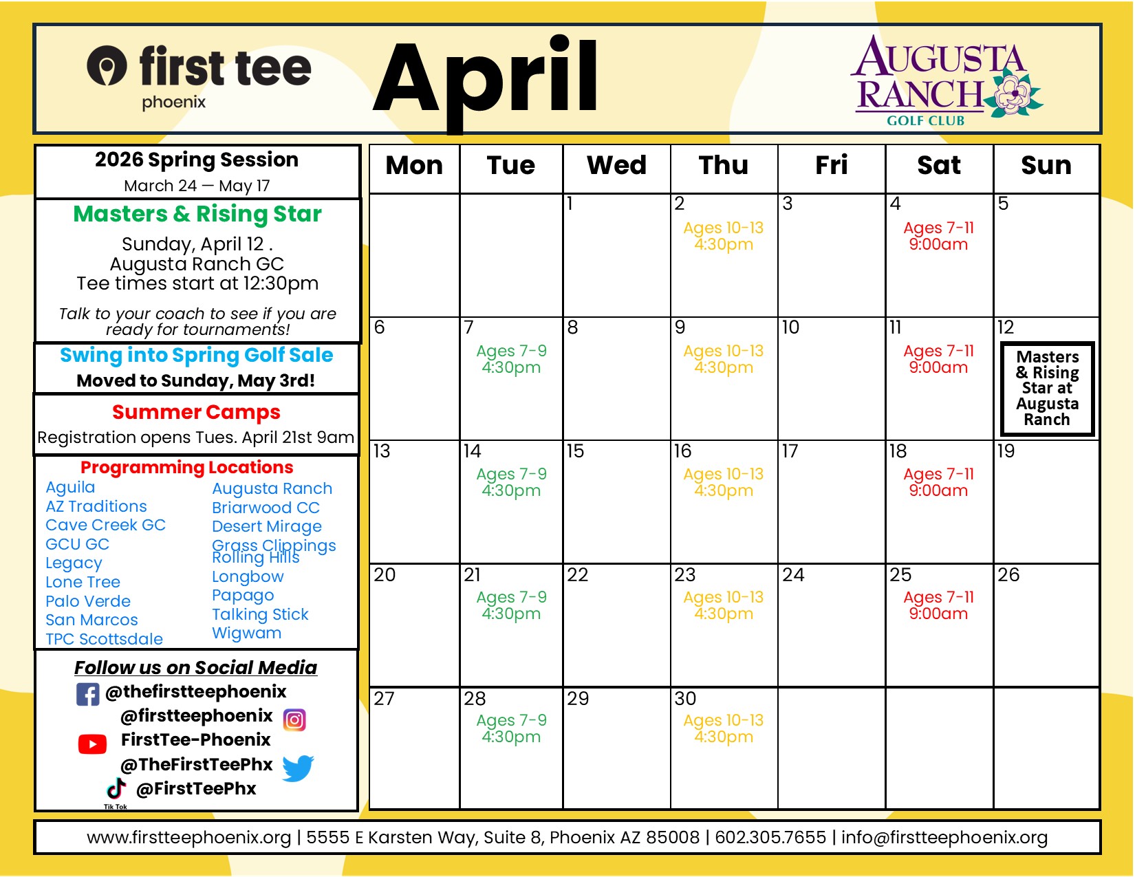 Members are invited throughout the year to special opportunities provided by First Tee – Phoenix locally, First Tee HQ and other partners. These opportunities will vary- discounted tickets to events, a family picnic, Golf sales, etc.