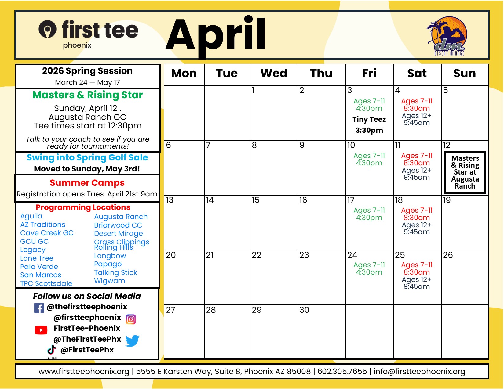 Members are invited throughout the year to special opportunities provided by First Tee – Phoenix locally, First Tee HQ and other partners. These opportunities will vary- discounted tickets to events, a family picnic, Golf sales, etc.