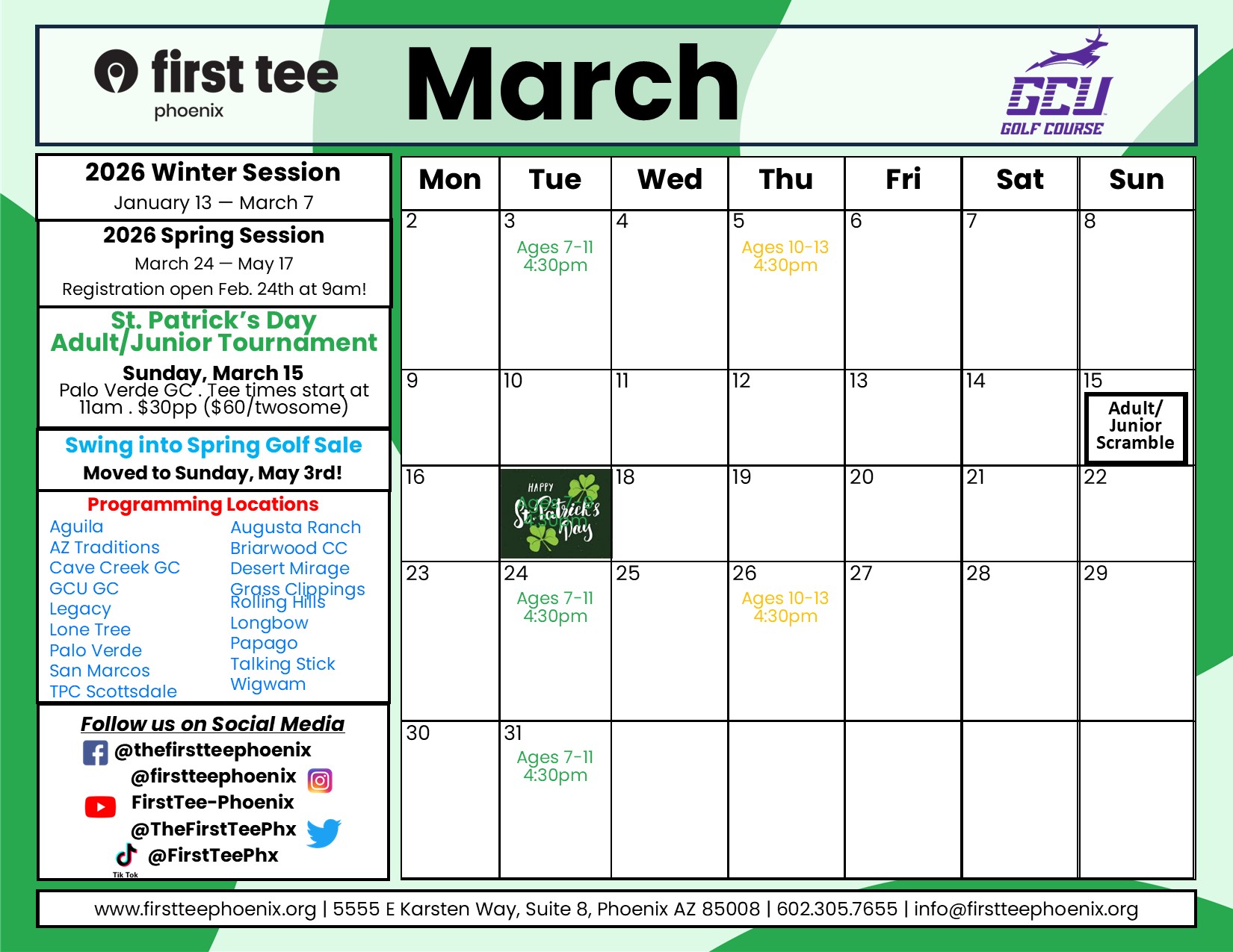 Members are invited throughout the year to special opportunities provided by First Tee – Phoenix locally, First Tee HQ and other partners. These opportunities will vary- discounted tickets to events, a family picnic, Golf sales, etc.