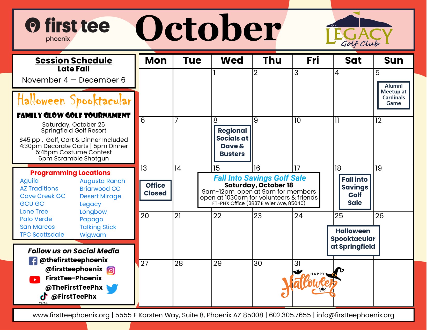 Members are invited throughout the year to special opportunities provided by First Tee – Phoenix locally, First Tee HQ and other partners. These opportunities will vary- discounted tickets to events, a family picnic, Golf sales, etc.